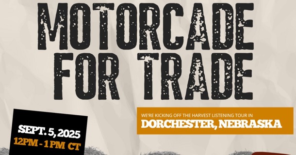 Dorchester, NE - Farmers for Free Trade will kick off its "Motorcade for Trade" harvest listening tour on, September 5th at Farmers Cooperative in Dorchester, Nebraska, joined by Rep. Adrian Smith (R-NE), Co-Chair of the Congressional Ag Trade Caucus and Chairman of the House Ways and Means Subcommittee on Trade. The event will feature the release of new Nebraska-specific data on agricultural trade's impact on the state's economy and launch a 2,500-mile, 14-state tour designed to amplify farmer voices calling for open markets and reduced trade barriers during this critical trade policy moment.